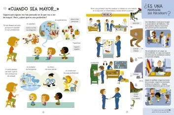 A través de ilustraciones a color, este libro realiza una amplia exposición de más de un centenar de profesiones relacionadas con ámbitos diversos como el colegio, el mercado, el arte, el hospital, el campo o la escuela de equitación. Para acercar la realidad concreta de muchas profesiones y alimentar o despertar vocaciones. Este libro responde a muchas preguntas sobre ellas y también anima a hacerse muchas más.